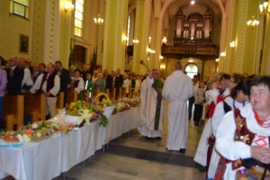 W południe barwny korowód wyruszył do Sanktuarium Matki Bożej Miłosierdzia – Pani Kazimierzowskiej gdzie odbyła się Msza Święta Dożynkowa, podczas której starostowie dożynek ofiarowali Ks. Dziekanowi i proboszczowi naszej parafii Franciszkowi Warzesze bochen chleba, a wszystkie sołectwa ofiarowały dary płodów rolnych. Zgodnie z tradycją korowód prowadziła muzyka, a za nią podążali starostowie dożynek, wieńce dożynkowe, poczty sztandarowe, goście zaproszeni, władze gminy, przedstawiciele sołectw, kół gospodyń wiejskich oraz mieszkańcy. Po Mszy Świętej korowód dożynkowy wrócił do Amfiteatru gdzie odbyło się oficjalne otwarcie dożynek, a starostowie złożyli bochen chleba na ręce gospodarza Wójta Gminy Rajcza Kaziemierza Fujaka z życzeniami aby mądrze nim dzielił i oby nikomu go nie zabrakło.