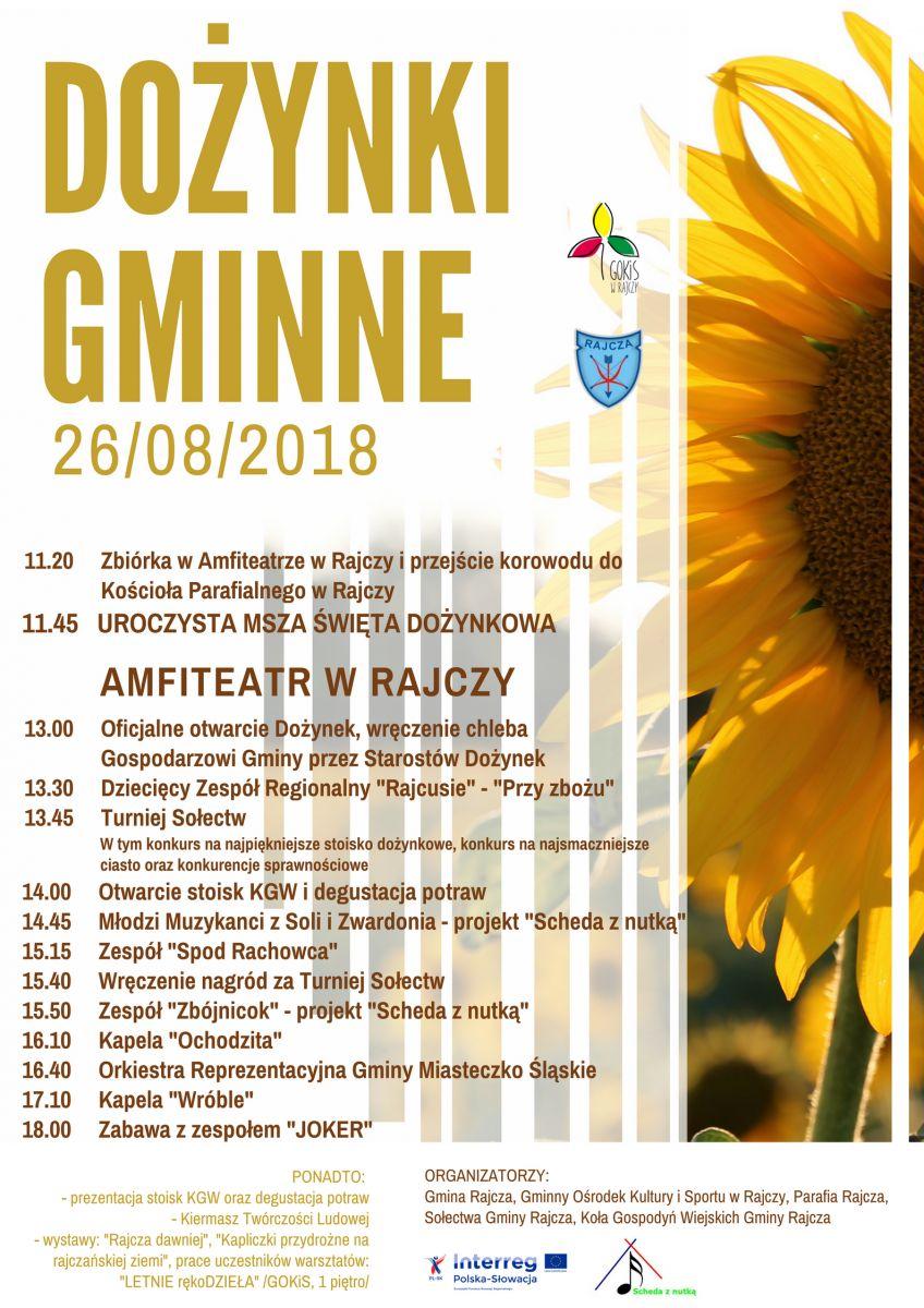 Już w najbliższą niedzielę 26 sierpnia zapraszamy do Rajczy na Dożynki Gminne. W programie m.in. wręczenie chleba dożynkowego Wójtowi Gminy Rajcza. Turniej Sołectw. Występy zespołów regionalnych, koncert młodych muzyków „Schedy z Nutką”, degustacje potraw regionalnych i wiele innych atrakcji. Szczegóły na plakacie.