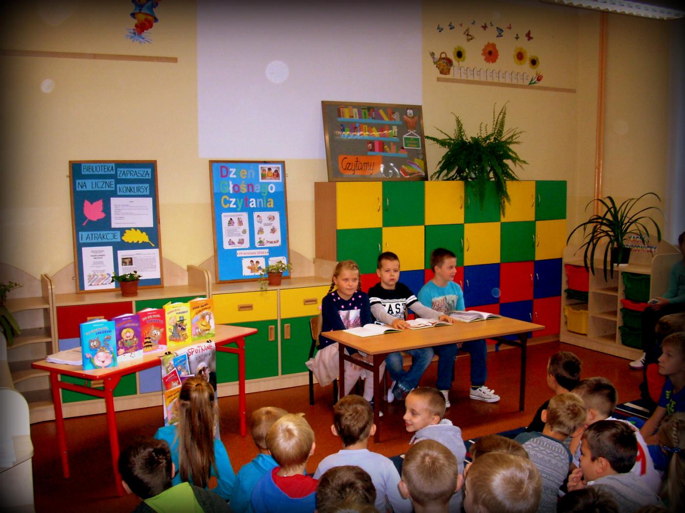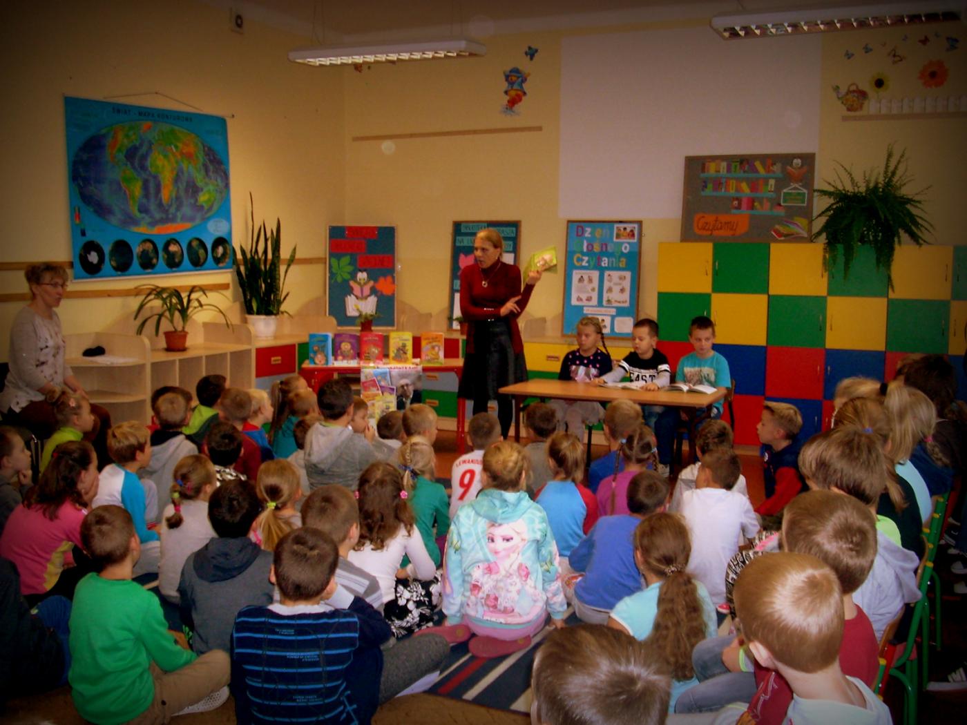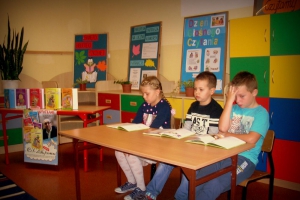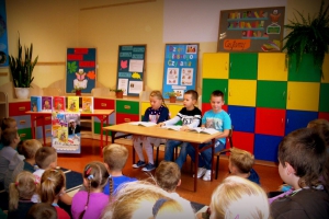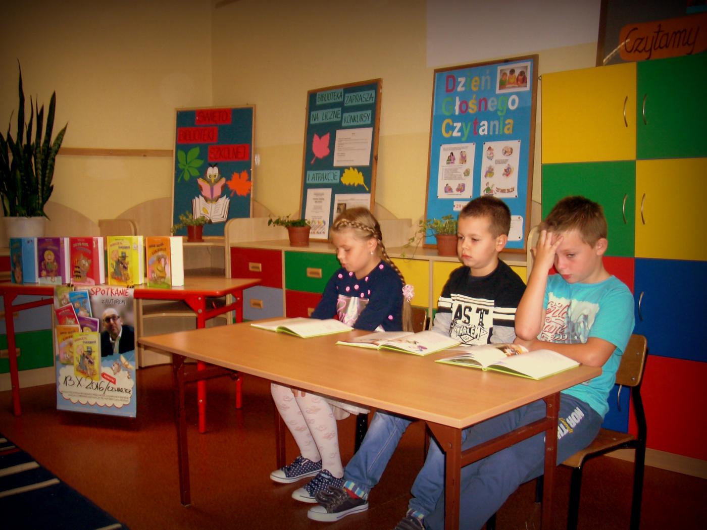 Z tej okazji 29 września uczniowie klas I-III SP wysłuchali opowiadań z książki Waldemara Cichonia pt. „Cukierku, Ty łobuzie”. Głośnego czytania o śmiesznych przygodach kota Cukierka podjęli się: Marta Worek – kl. 2 a, Dawid Wydra – kl. 2 c, Krystian Marszałek – kl. 3 a, Kacper Jonkisz – kl. 2 b, Michał Śleziński – kl. 3 b, Krzysztof Marszałek – kl. 3 c. Wielkie brawa dla nich! Spotkanie upłynęło w miłej, wesołej atmosferze. Miejmy nadzieję, że spotkania takie zaowocują w przyszłości , bo jak mówi przysłowie: „czym skorupka za młodu nasiąknie, tym na starość trąci”.