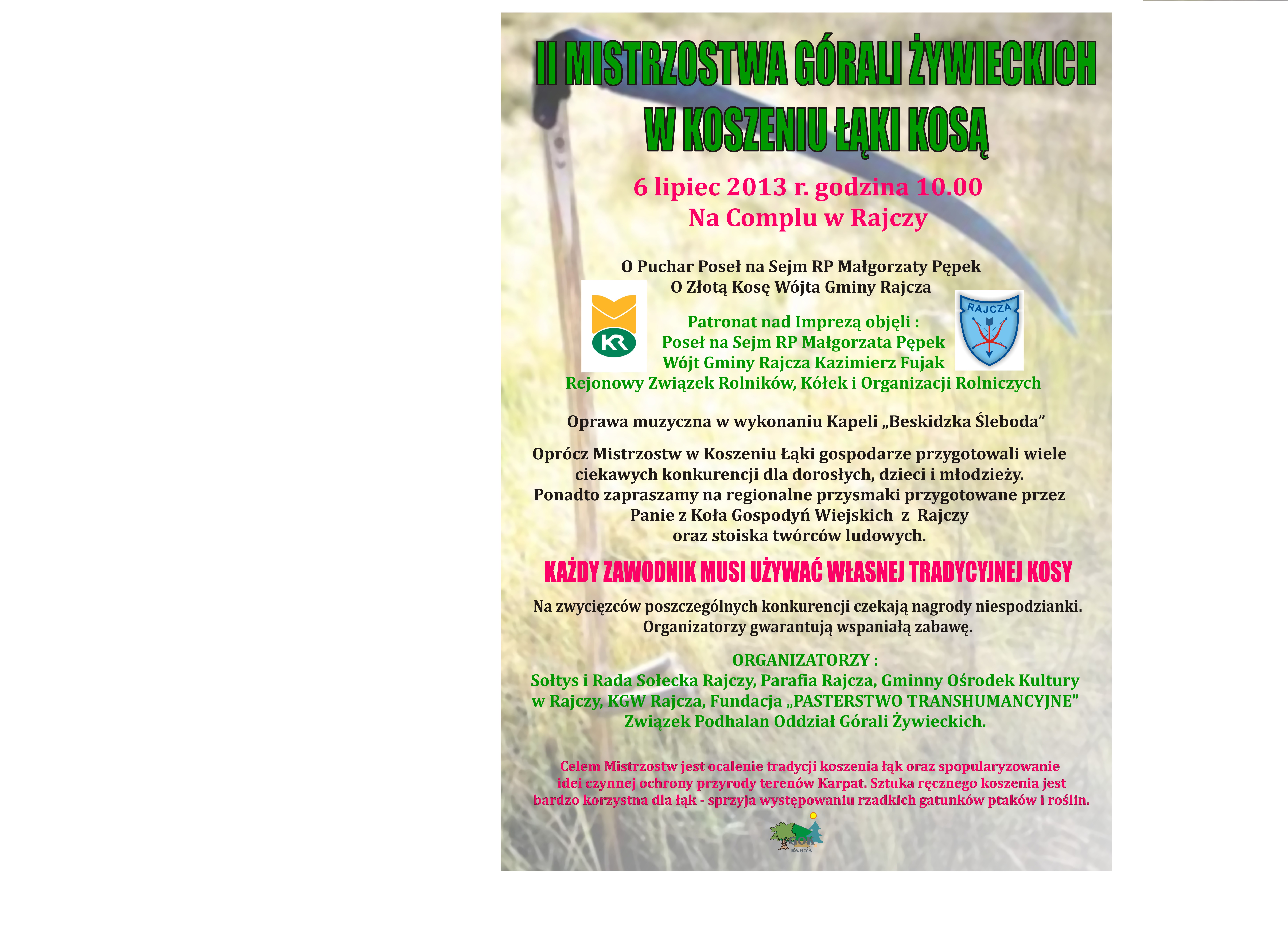 6 lipca 2013 r. na Complu w Rajczy odbędą się II Mistrzostwa Górali Żywieckich w Koszeniu Łąki Kosą. Serdecznie zapraszamy do wzięcia udziału.