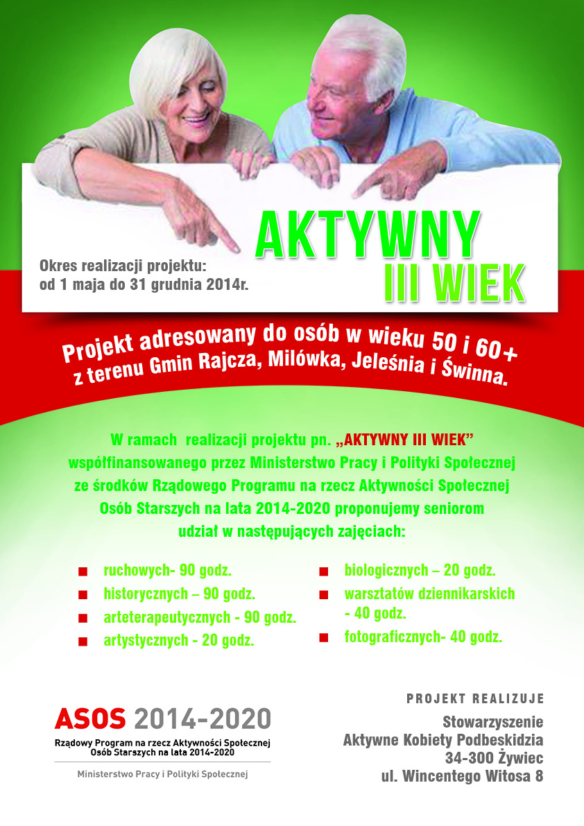 Od czerwca br. rozpoczęła się realizacja projektu pn. Aktywny III wiek współfinansowanego przez Ministerstwo Pracy i Polityki Społecznej ze środków Rządowego Programu na rzecz Aktywności Społecznej Osób Starszych na lata 2014-2020. Projekt adresowany jest do osób powyżej 50 roku życia z gminy Rajcza, Milówka, Jeleśnia i Świnna. W ramach projektu przewidziano zajęcia: artystyczne, ruchowe, historyczne, arteterapeutyczne, biologiczne, warsztaty dziennikarskie i fotograficzne, atrakcyjne wycieczki, spotkania kulturalne i wyjazdy na basen, do kina lub teatru. Liczebność seniorów przerosła najśmielsze oczekiwania. Bardzo aktywnie działają grupy z Rajczy, Zwardonia, Soli i Rycerki Dolnej.