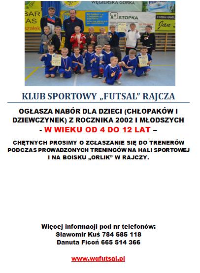 Klub sportowy "Futsal" Rajcza organizuje nabór chłopców i dziewczynek z rocznika 2002 i młodszych. Więcej informacji na plakacie poniżej.