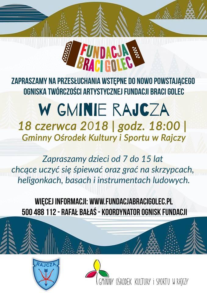 Zapraszamy na przesłuchania do nowo powstającego Ogniska Twórczości Artystycznej Fundacji Braci Golec. Przesłuchania odbywać się będą w Rajczy 18 czerwca. Szczegóły na plakacie.