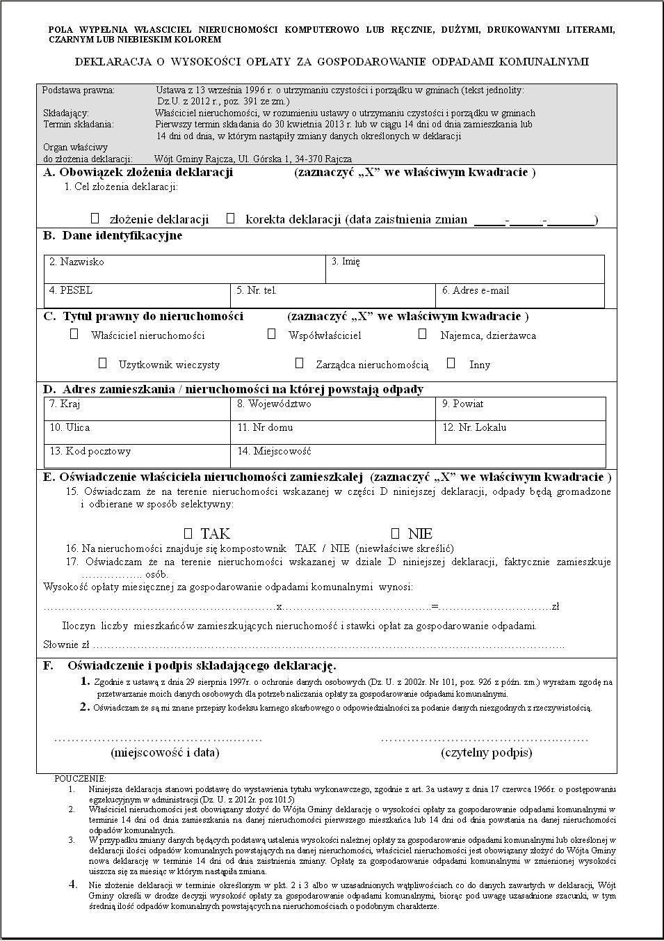 W związku z nowelizacją Ustawy o utrzymaniu czystości i porządku w gminach z dnia 13 września 1996r. (Dz.U. z 2012 r., poz. 391 ze zm.) każdy Właściciel nieruchomości zobowiązany jest do złożenia „Deklaracji o wysokości opłaty za gospodarowanie odpadami komunalnymi”.