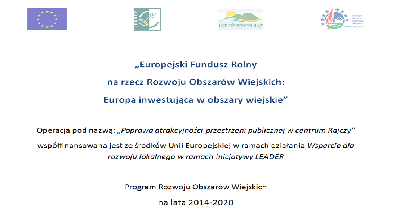 Gmina Rajcza realizuje projekt współfinansowany przez Unię Europejską z Europejskiego Funduszu Rolnego na rzecz Rozwoju Obszarów Wiejskich na lata 2014-2020 pn. „Poprawa atrakcyjności przestrzeni publicznej w centrum Rajczy”.