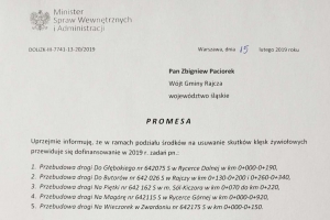 W dniu 13 marca 2019r w Sali Marmurowej Śląskiego Urzędu Wojewódzkiego w Katowicach, z rąk Wojewody Śląskiego Jarosława Wieczorka, Wójt Gminy Rajcza Zbigniew Paciorek odebrał promesę przeznaczoną na usuwanie skutków klęsk żywiołowych. Promesa dotacyjna dla Gminy Rajcza wynosi 1.280.000zł.