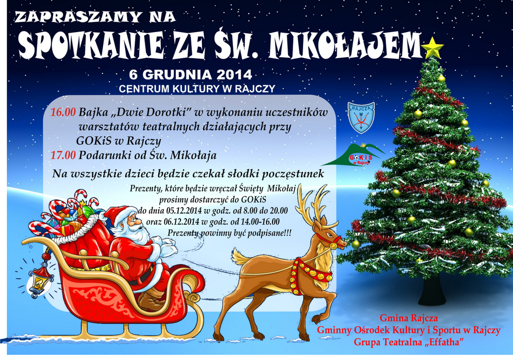 6 grudnia do Rajczy zawita Święty Mikołaj, serdecznie zapraszamy wszystkie dzieci na spotkanie z nim. Szczegóły na plakacie zamieszczonym poniżej.