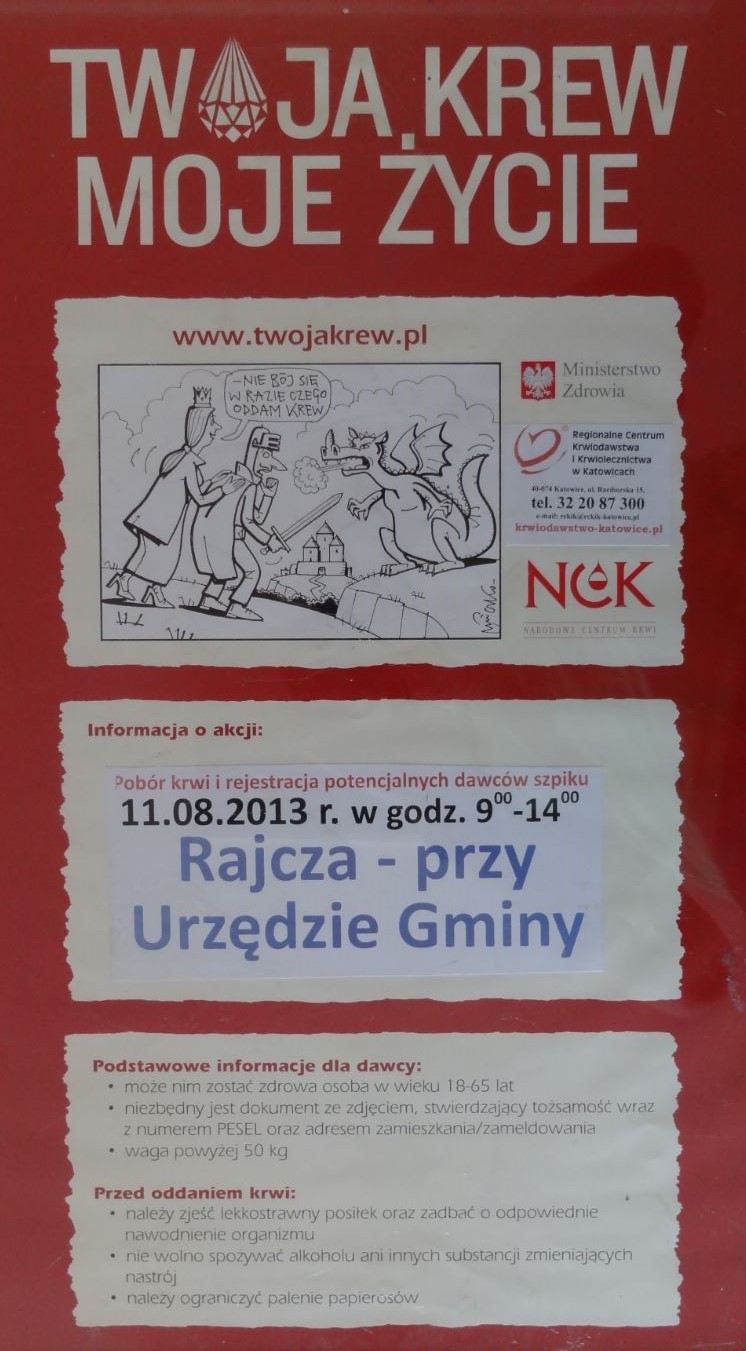 W niedzielę 11 sierpnia, w godzinach od 9.00 do 14.00 przy Urzędzie Gminy w Rajczy, odbędzie się akcja zbiórka krwi i rejestracja potencjalnych dawców szpiku kostnego.