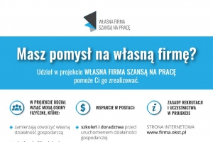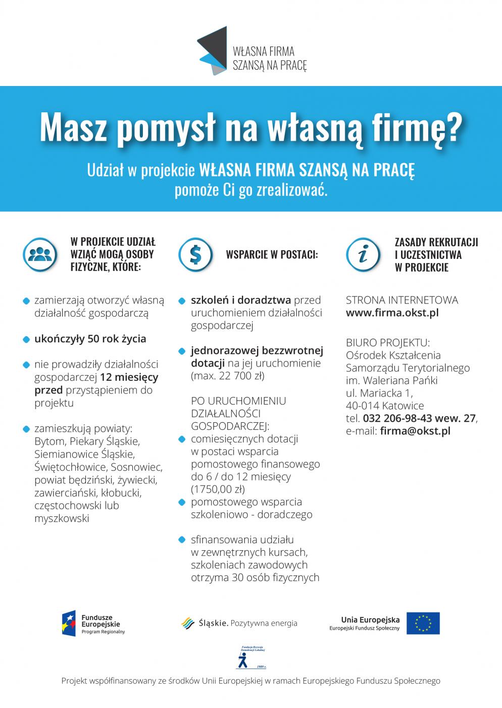 Będziemy wdzięczni, jeśli osoby zainteresowane udziałem w projekcie będziecie Państwo kierować do Ośrodka Kształcenia Samorządu Terytorialnego im. Waleriana Pański w Katowicach, ul. Mariacka 1. Informacji nt. projektu udziela p. Magdalena Szot dostępna pod nr telefonu 32 206 80 39, 32 206 98 43 wew. 27 oraz adresem mailowym firma@okst.pl. Zachęcamy również do odwiedzenia strony internetowej projektu www.firma.okst.pl.