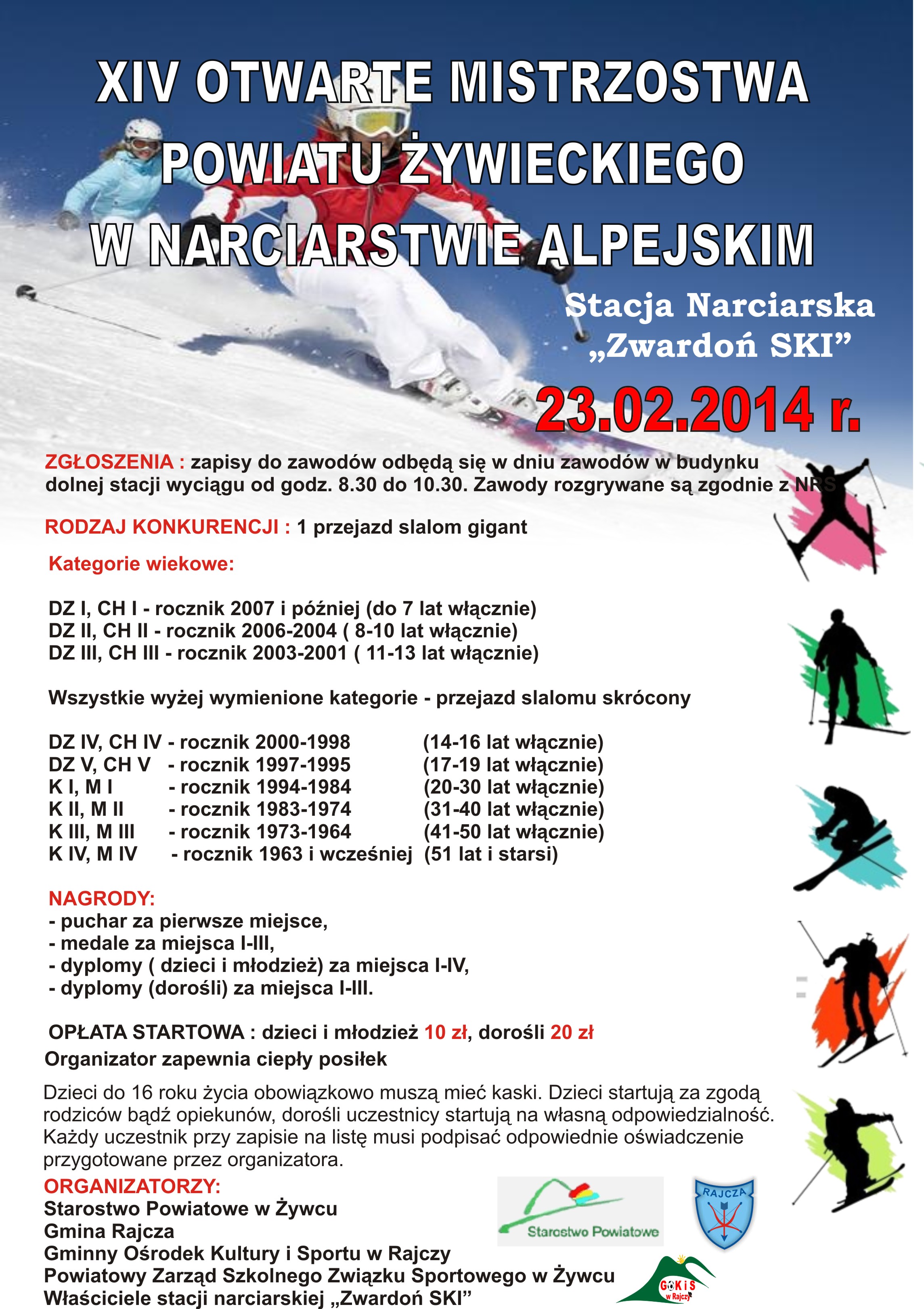 Już w najbliższą niedzielę (23 lutego) zapraszamy bardzo serdecznie na XIV Otwarte Mistrzostwa Powiatu Żywieckiego w narciarstwie alpejskim, które w tym sezonie wyjątkowo przeprowadzone zostaną w stacji narciarskiej ZwardońSki w Zwardoniu.