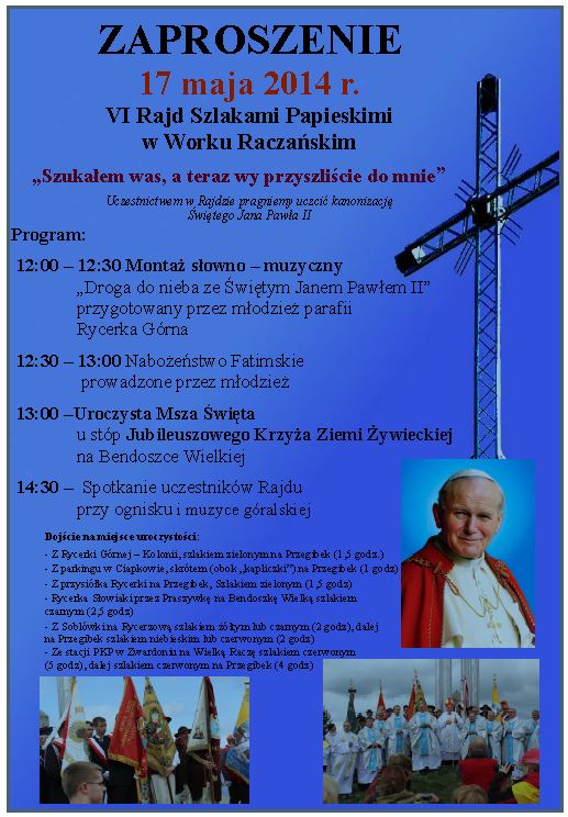 Serdecznie zapraszamy do wzięcia udziału. Dla uczestników przygotowano autobusy, które odjadą z Rajczy do Rycerki Górnej w dniu 17 maja o godz. 9.00 i 9.30 sprzed budynku Centrum Kultury. Szczegóły Rajdu na plakacie.