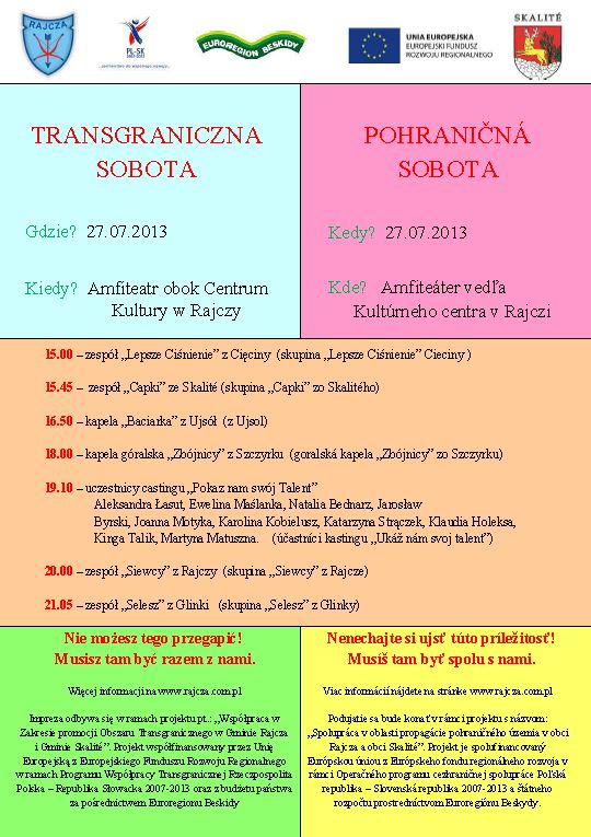 Już w przyszłą sobotę, 27 lipca 2013 roku Gmina Rajcza zaprasza wszystkich do udziału w imprezie plenerowej organizowanej w ramach projektu „Współpraca w Zakresie Promocji Obszaru Transgranicznego w Gminie Rajcza i Gminie Skalité”. Wspólna zabawa rozpocznie się o godz. 15.00 w Amfiteatrze przy Gminnym Ośrodku Kultury w Rajczy.